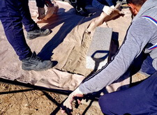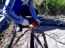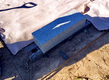 Приступив к работе, мы, первым делом, очистили могилу от травы. Затем положили по периметру места захоронения пятисантиметровую металлическую полосу, которая будет служить границей и дополнительной опорой брусчатке. Получившийся прямоугольник свариваем по углам.